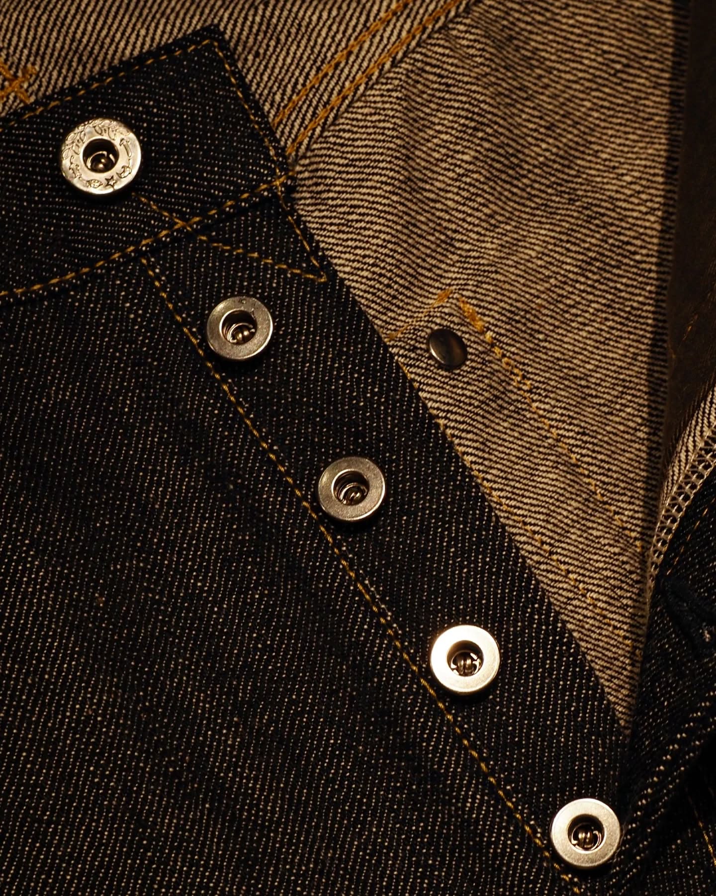 月桂樹ボタンは大戦モデルの象徴であり、今回はTHREE KINGDOMS OVERALLS ロゴ入りオリジナル月桂樹鉄ボタンとロゴなし鉄ドーナツボタンを製作し、トップボタンとフライ部分に使用し、大戦のディテールを再現しています。