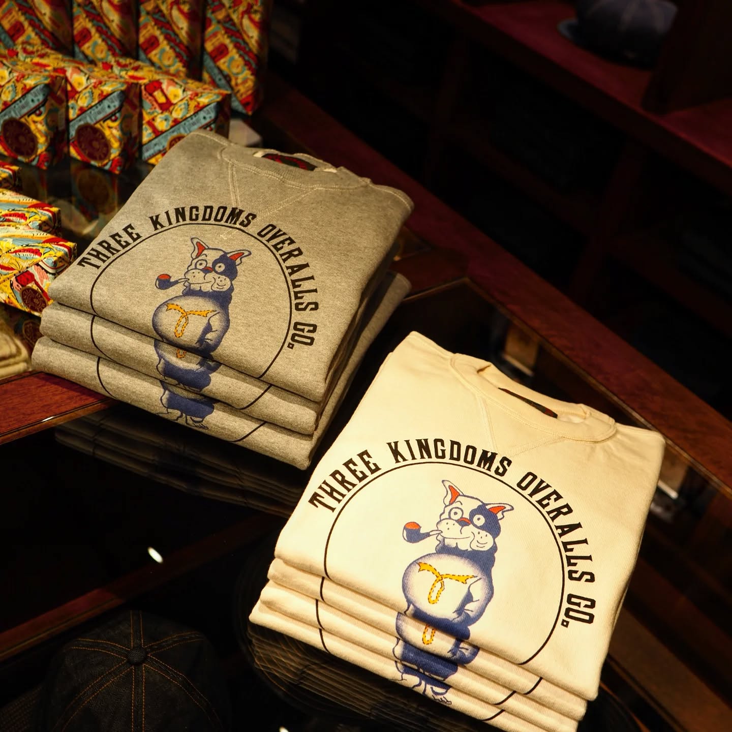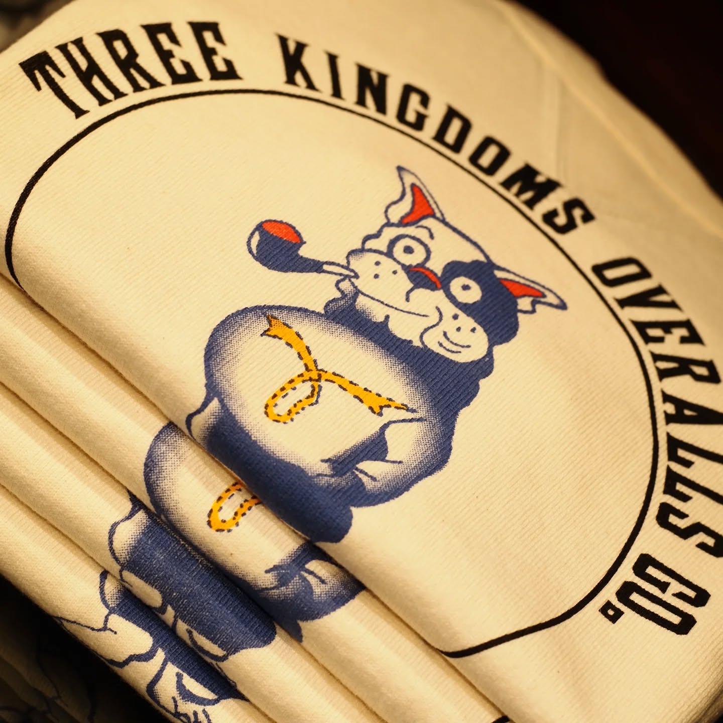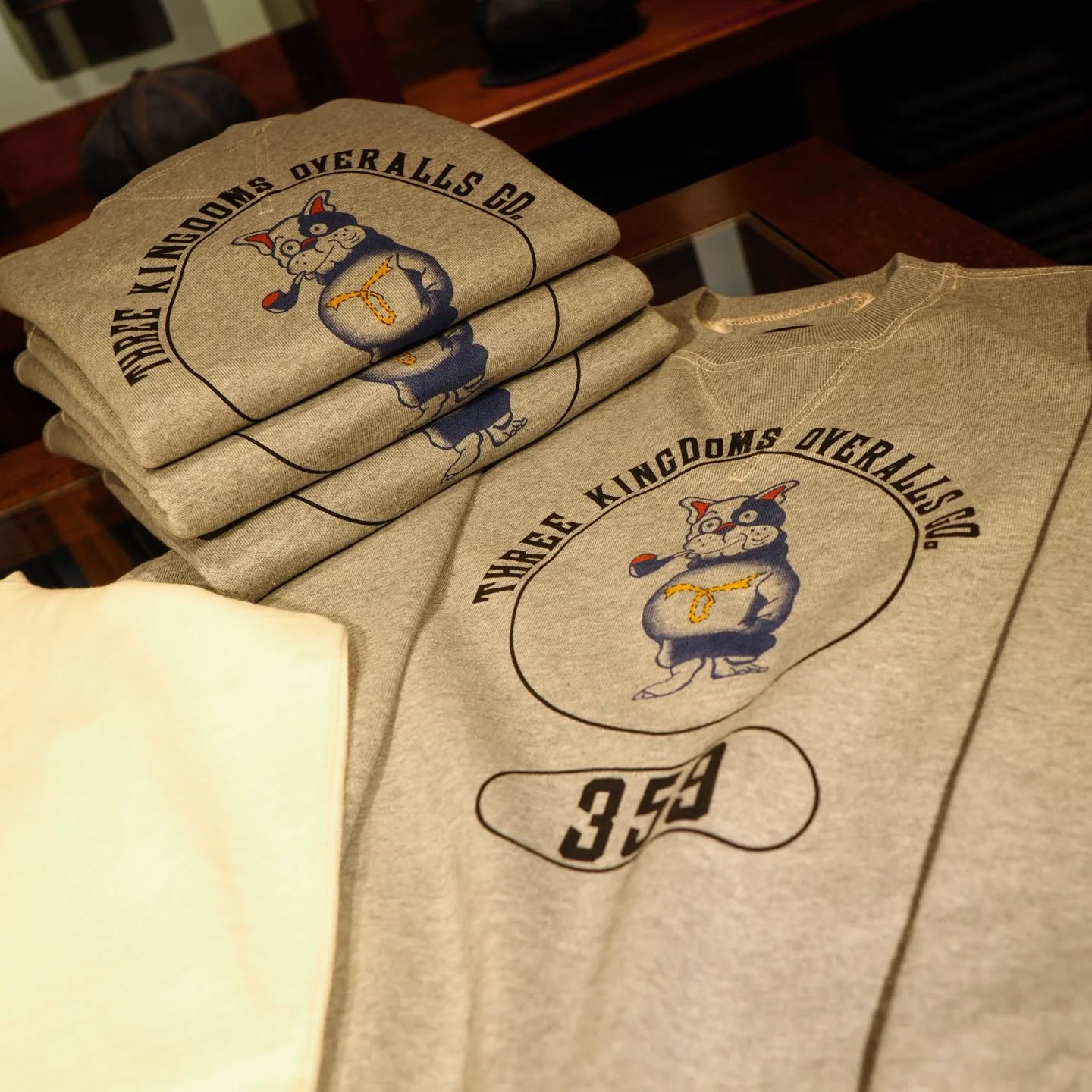 手摘みタンザニアオーガニックコットンの温かみとしなやかさが虜にさせ、THREE KINGDOMS OVERALLS の要素を取り込んだビンテージブルドッグの染み込みプリントの雰囲気も大変よく、着込んでいくうちにプリントが段々と薄くなっていき、生地と共に経年変化を楽しめる一枚です。スウェットもTシャツも育てて行きましょう
